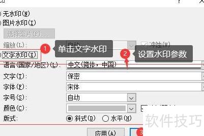 单击水印按钮,在下拉列表中选择自定义水印命令,即可调整水印样式,所示。