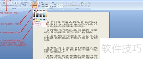 设置方法:在页面设置选项卡的页面背景组中,点击页面颜色下拉按钮,从菜单中选择所需颜色进行填充。若预设颜色不符合需求,可选择其他颜色,打开颜色对话框,从中选取更丰富的色彩完成填充。具体操作步骤及效果所示。该功能便于用户自定义页面背景,提升文档视觉效果与个性化程度。