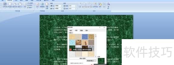 设置方法与颜色填充相近,只需点击页面颜色下拉菜单中的填充效果。这里有渐变、纹理、图案和图片四种方式,操作方式基本相似。以纹理填充为例,在弹出的填充效果对话框中,默认显示渐变选项卡,此时切换至纹理选项卡,浏览并选择一种所需纹理样式,确认后即可应用。整个过程简单直观,最终效果可立即预览,具体操作步骤与呈现效果所示。