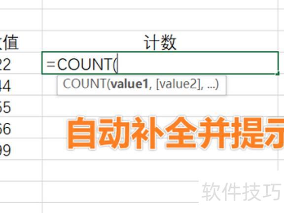 打开Excel,在单元格输入=COUNT,接着按Tab键,若首个提示为所需函数,即可自动补全。