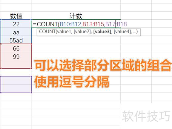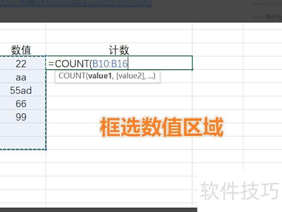此时可输入参数,COUNT函数的首个参数可直接选取区域。