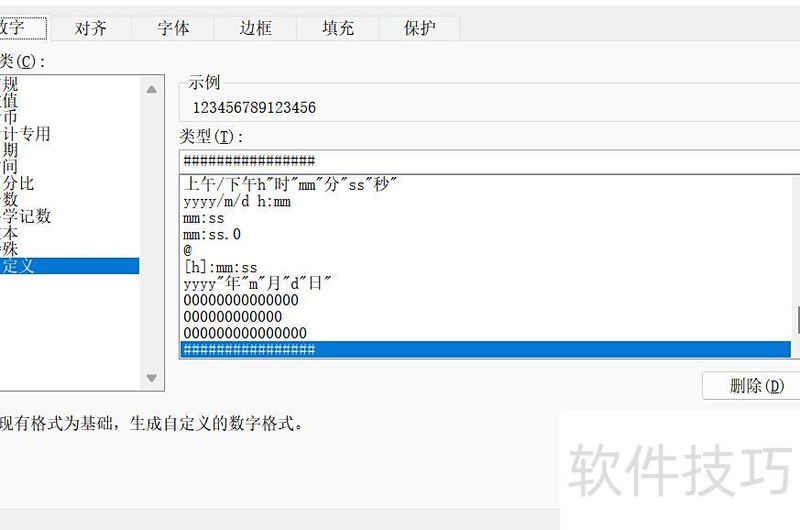 在数字选项卡中选择自定义类型,输入与数据最大位数相同的符号,个数对应最大位数,点击确定完成设置。