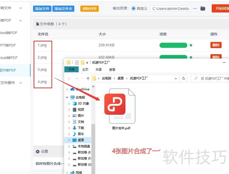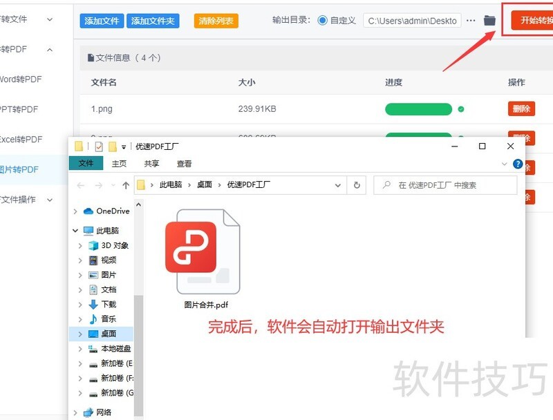 完成前三步后,点击开始转换按钮,软件会自动将上传的多张图片合并为一个PDF文件,并在完成后弹出输出文件夹,方便用户直接查看已生成的PDF文档。