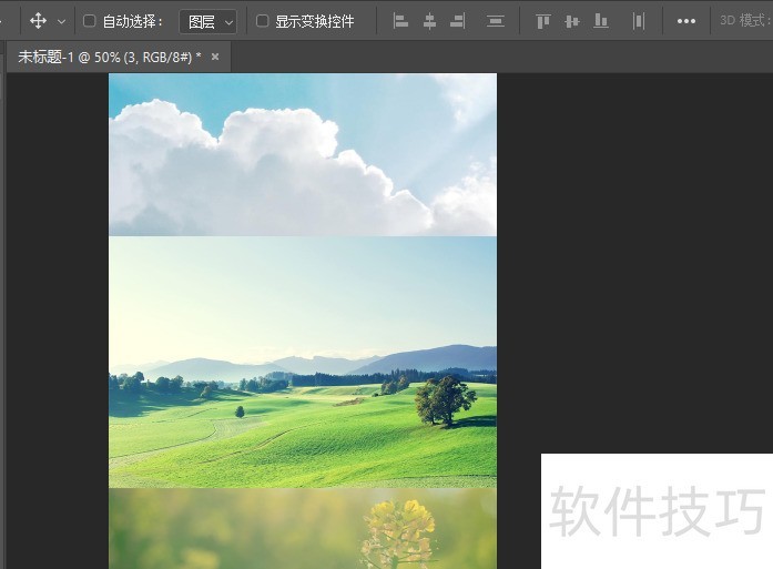 第二步,将需合并的图片全部导入新建图层,按实际需求调整排列位置,确认无误后,将所有图层进行合并操作。