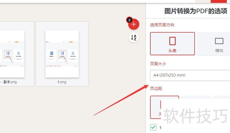 第二步:点击图中红色按钮,导入需合并的图片。随后在右侧设置合并参数,如合并方向、页面尺寸、边距等选项。