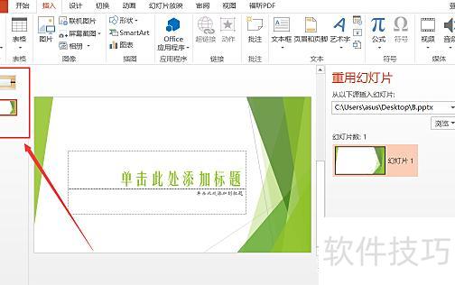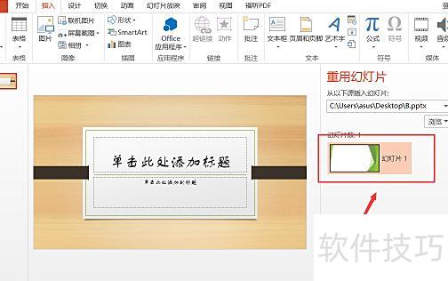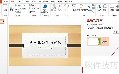 点击菜单栏插入→新建幻灯片→重用幻灯片即可。