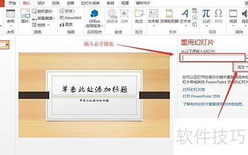 点击后,PPT页面右侧将弹出重用幻灯片窗口,选择浏览即可。