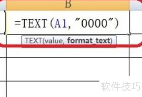 四、在首行输入公式:=TEXT(A1,0000),将数值转为四位数文本格式。