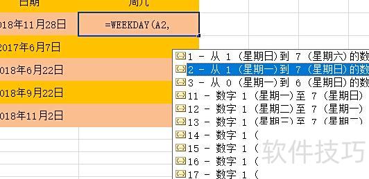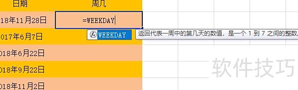 输入=weekday调用函数,系统将自动提示后续操作步骤。