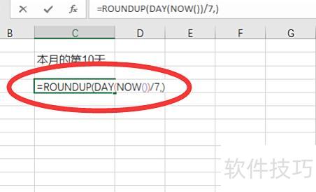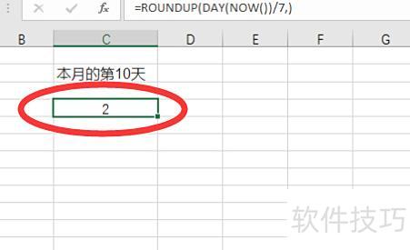若需计算当前日期在本月的第几周,可输入公式:=ROUNDUP(DAY(NOW())/7,)。