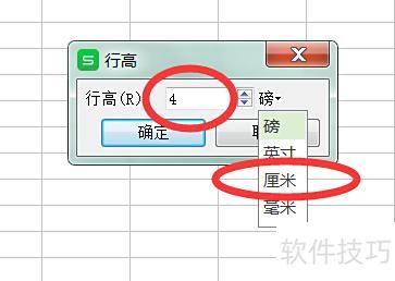 在弹出的行高设置对话框中,将单位设为厘米,输入行高值为4,确认即可。