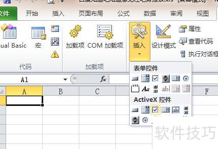 进入开发工具选项卡,选择插入,从弹出菜单中选取ActiveX控件中的复选框。
