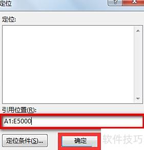 按下Ctrl+G打开定位窗口,在引用位置输入A1:E5000,确认即可完成操作。