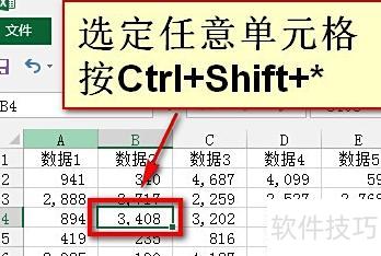 选中单元格区域中的任一单元格,按下Ctrl+Shift+*,即可快速选定整个连续区域。