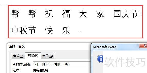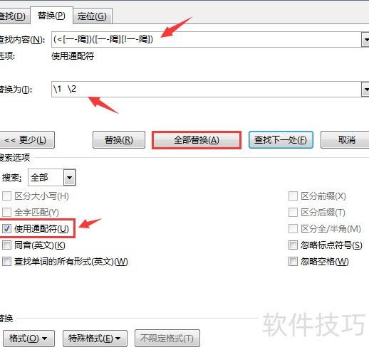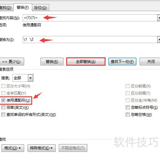 按Ctrl+H打开替换功能,在查找内容中输入(<)(),注意使用英文输入法下的符号。替换为栏输入1 2,数字之间保留两个空格。务必勾选使用通配符选项,然后点击全部替换按钮执行操作。整个过程需确保符号和空格准确无误,以保证替换成功。