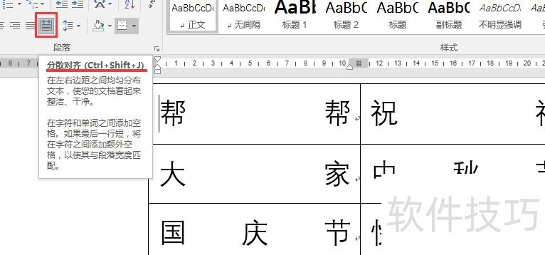 若表格紧凑,可全选后设为分散对齐;若表格较宽,如范例所示,则此对齐方式会影响美观。