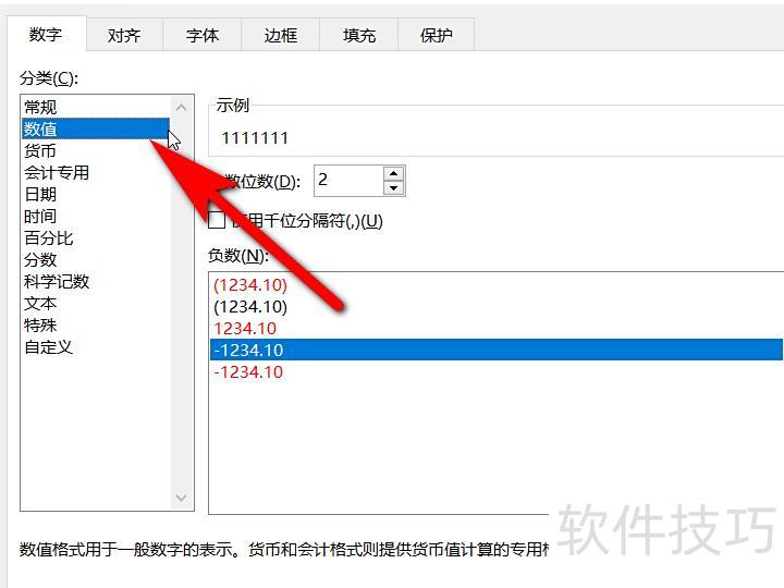 在设置单元格格式中,选择数字类别下的数值选项,然后点击确定完成设置。