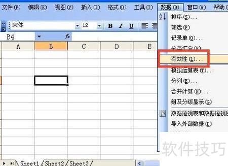 点击数据后显示下拉菜单,再点击其中的有效性选项。