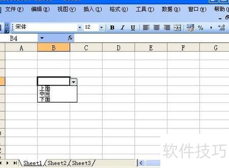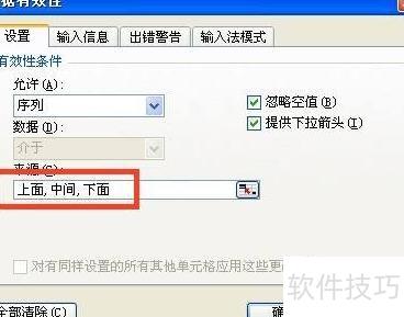 在来源栏中输入下拉选项内容,例如上面,中间,下面,使用英文逗号分隔,完成后点击确定。