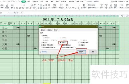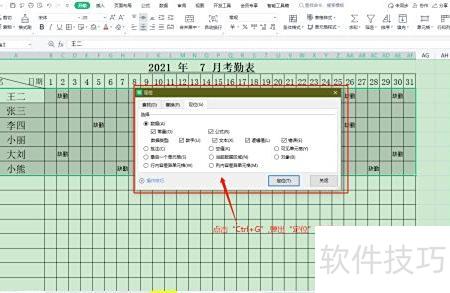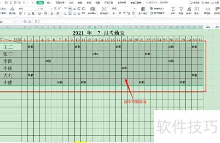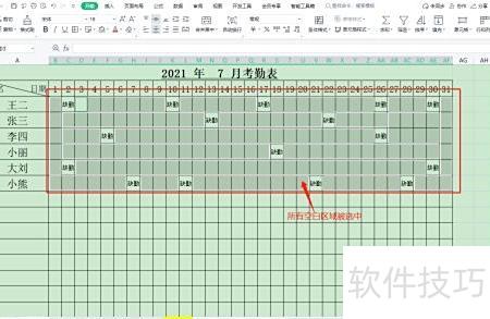 返回Excel后,考勤表内所有空白区域均被自动选中。