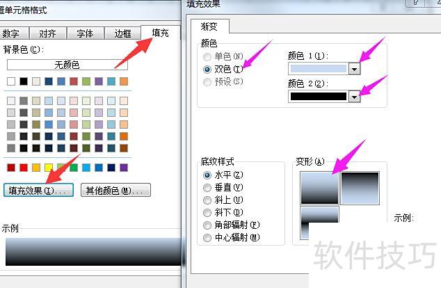 若为正视楼梯图,可将单元格列宽设为16、行高设为30;右键选择设置单元格格式,进入填充选项中的填充效果,选用双色搭配,颜色1为浅灰色,颜色2为黑色,排列方式设为水平。