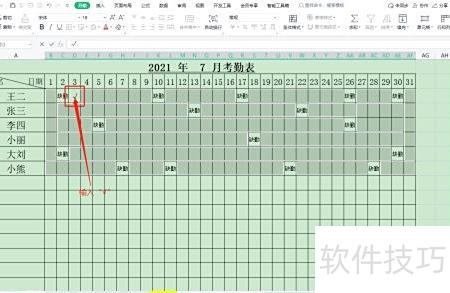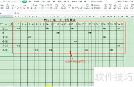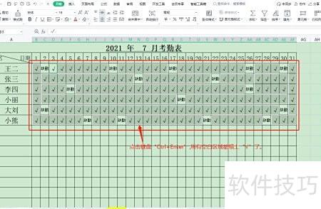 考勤表中非缺勤日期均视为正常出勤,统一用√批量标注。