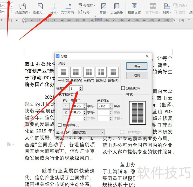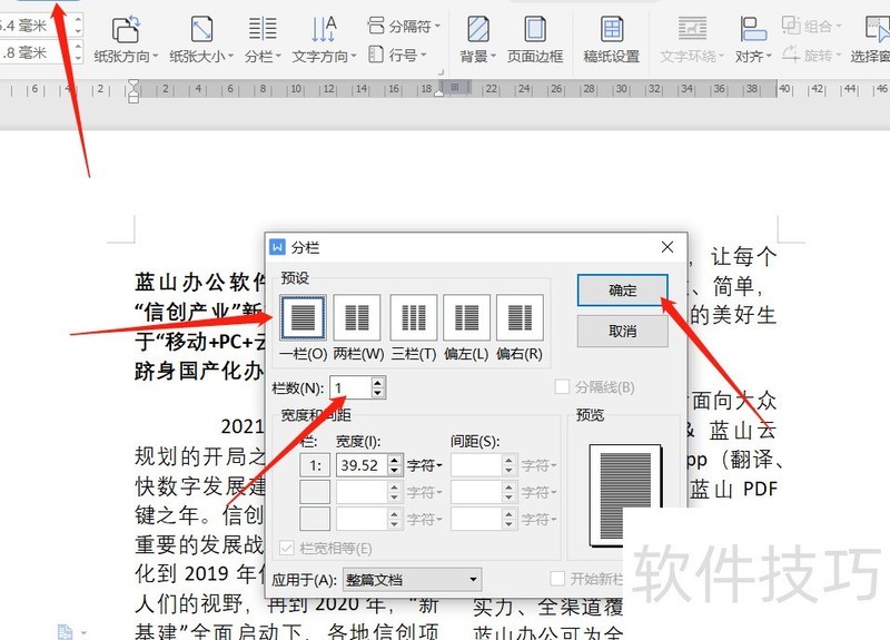 首先打开Word文档,接着切换至选项卡,点击按钮并选择。在弹出的设置面板中,将预设改为,并在下拉菜单中选择,最后点击完成操作。此时,文档即恢复为单栏排版,成功取消了分栏效果。