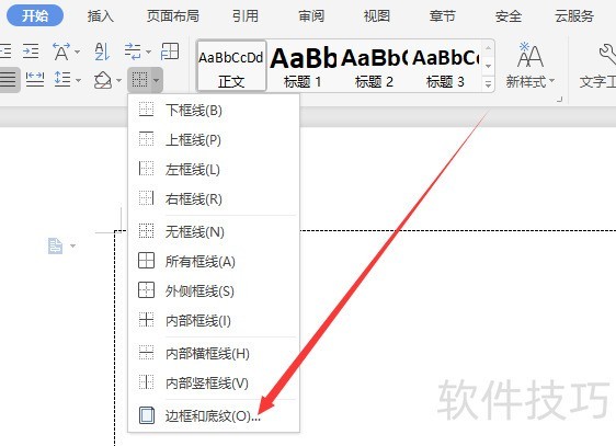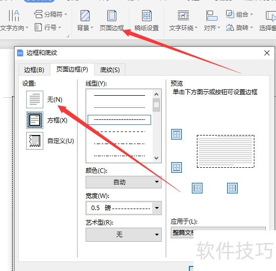 在弹出窗口中选择页面边框,设置为无边框后点击确定,即可去除Word文档中的虚线。