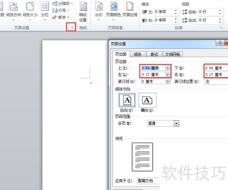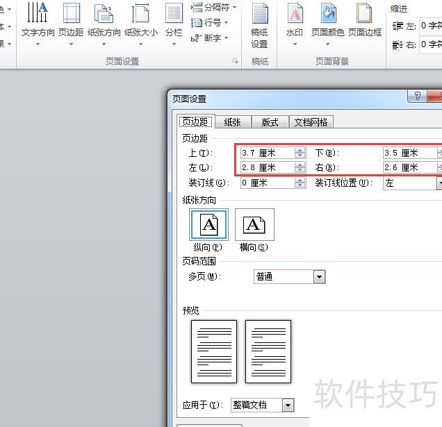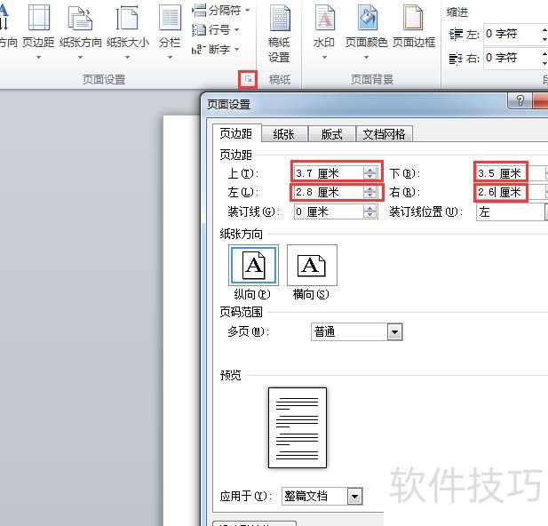 在页面布局选项卡中打开页面设置,调整上下左右边距为公文常用标准。