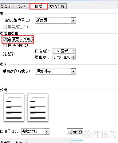 进入页面设置,选择版式,勾选奇偶页不同选项。
