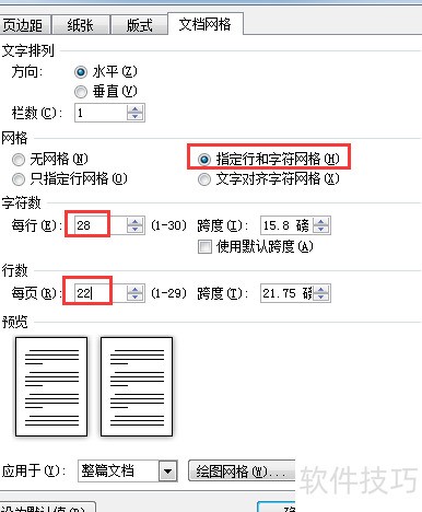 在文档网络中选定行与字符,每行28字符,每页22行。