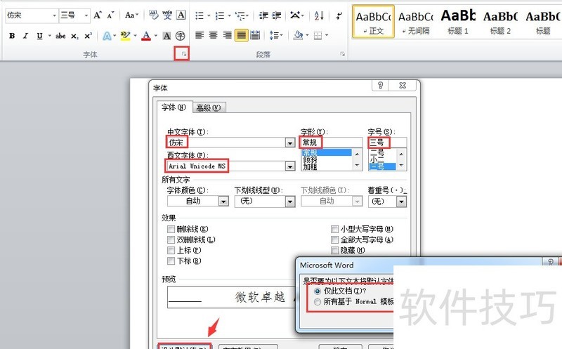 字体也需要调整,进入字体设置,选择适用于公文应用文的字体制式,并设为默认,可选择应用于所有Word文档(第二项)。