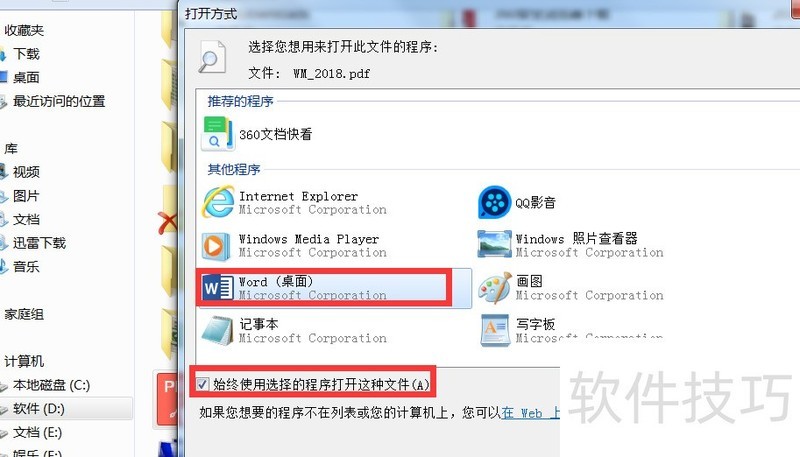 若电脑中已安装其他PDF阅读器,但仍想用Word直接打开PDF文件,可右键点击文件,选择打开方式并指定Word为默认程序。如希望今后所有PDF文件均以此方式打开,勾选始终使用此程序打开此类文件的选项,此后系统将自动以Word默认打开PDF文档,无需重复设置。