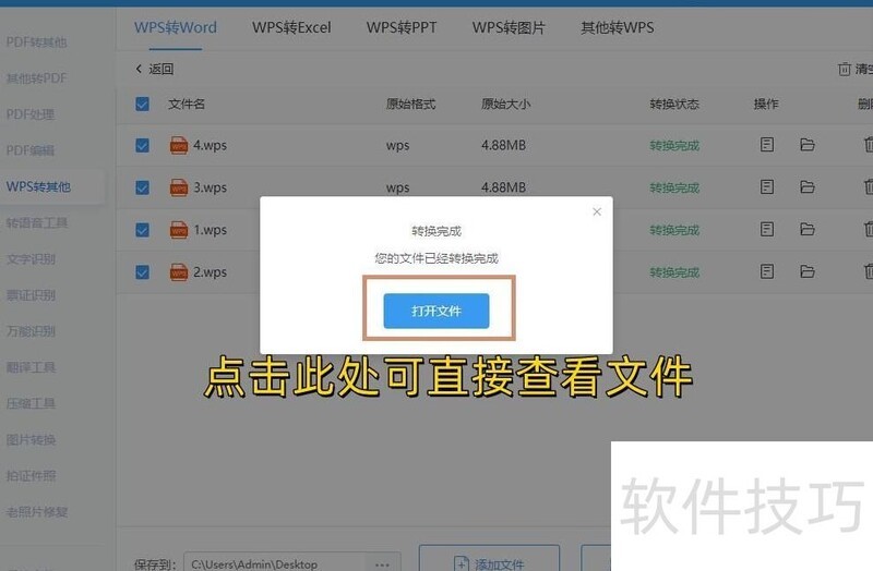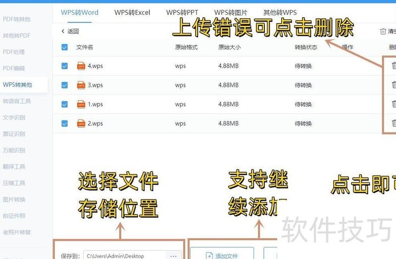 如有遗漏文件可继续点击,导入错误的文档可通过图标删除,确认无误后选择位置,最后点击,即可完成WPS转Word操作。