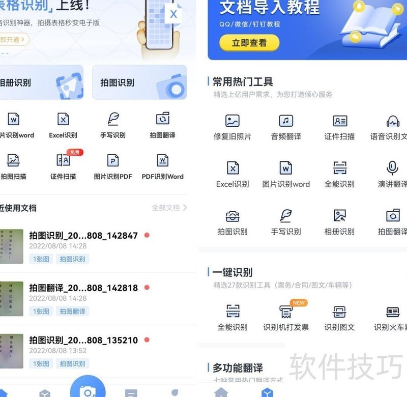 该软件不仅支持文字识别,还具备拍照、音频及视频翻译功能,可将音视频内容转为文字,英语听力难懂时可直接转换为译文对照学习,并支持实时翻译。