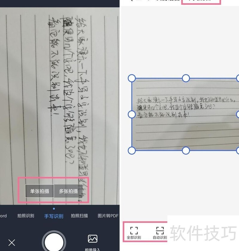 使用它识别印刷文字或手写内容都非常便捷,开启相应功能后可直接拍照或上传图片进行识别。支持连续拍摄多张照片,还能对图像进行旋转、加滤镜等简单编辑,并可调整识别区域,最后点击识别即可完成操作。