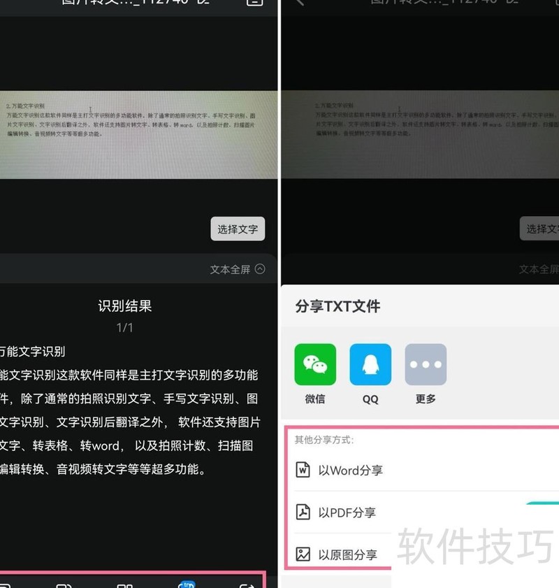 点击识别即可扫描图片中的文字,结果支持修改、复制、翻译,并具备智能排版与语义纠错功能,还可导出为Word或PDF格式。