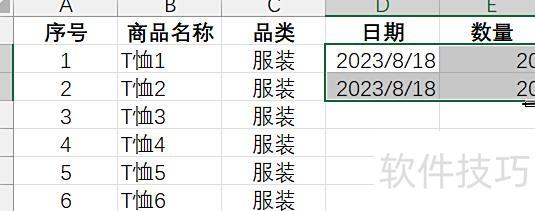 对于日期和数字类型,在下一单元格输入相同内容,选中这两行数据,当光标变为黑十字时向下拖动填充;若左右相邻列存在连续非空单元格,光标变黑十字后双击即可自动填充。