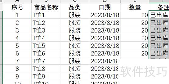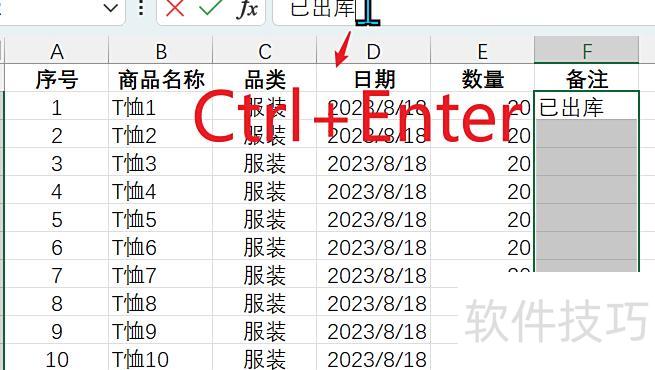 在输入内容后,保持光标闪烁状态,按住Ctrl键的同时再按下Enter键。例如,在选定的F2:F11区域输入已出库后,立即同时按下Ctrl+Enter完成批量填充。