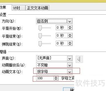 将动画文本设为按字母,字母间延迟百分比调至100%,参照图示,点击确定完成设置。