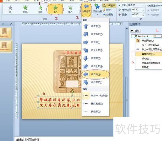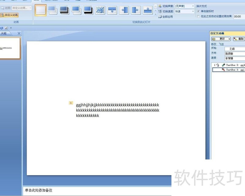 选中文字或文本框,点击动画选项,选择自定义动画,添加飞入进入效果,设置为单击开始、自底部进入、速度非常慢。