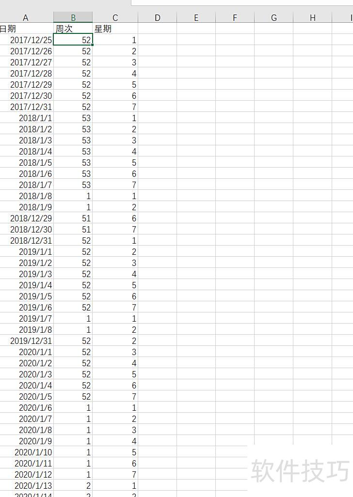 根据相关规定,往年如2026年和2026年也应遵循相同的周数计算规则。若某一年出现第53周,则其后连续五至六年通常只会存在第52周(因52周共364天)。按照此规则推算,2026年包含第53周,因此2026年与2026年均仅有52周,不存在第53周。图中C列列出星期以便对照周次,可清晰看出2026年并无第53周的对应日期。