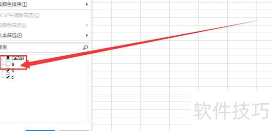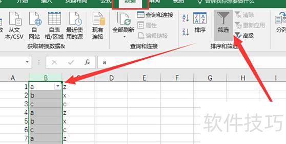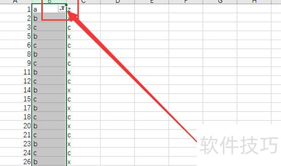 在B栏点击下拉箭头,取消全选,勾选b和c,表格中即仅显示b、c对应的数据。