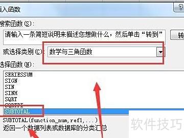 在插入函数对话框中,选择数学与三角函数类别,找到并选中SUBTOTAL函数;也可在搜索栏直接输入SUBTOTAL进行查找。确认后,在弹出的参数设置框中第一个参数位置输入数字3。