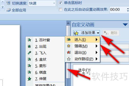 在右侧自定义动画中点击添加效果-进入,选择一种进入动画即可。