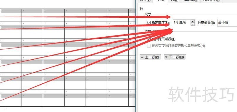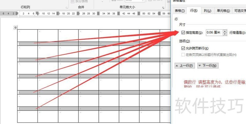 调整表格宽度,奇数行高设为1.8厘米,偶数行高设为0厘米。