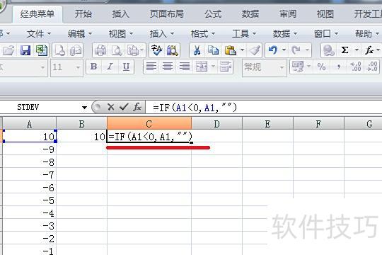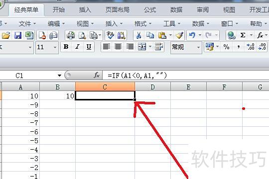 在C1单元格输入公式:=IF(A1<0,A1,),按回车确认。