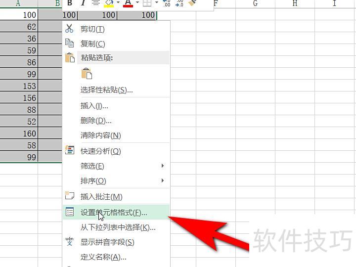 选中数据区域,右键点击,在弹出的菜单中选择设置单元格格式并点击打开。