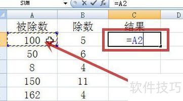 在C2单元格中先输入等号=,然后点击代表被除数100的单元格(红色箭头指向处)。
