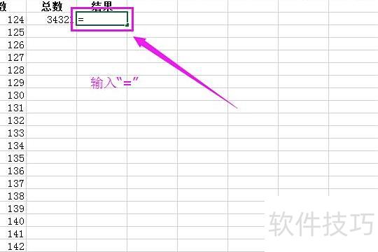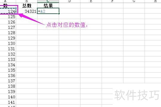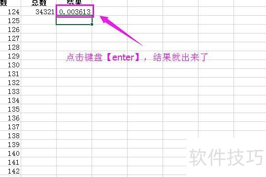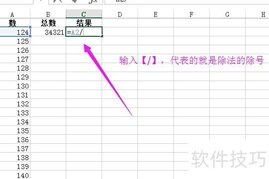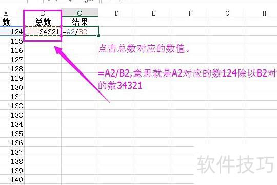 输入除号后,点击B列第二行的数据(34321),结果列将显示公式A2/B2,表示124除以34321。